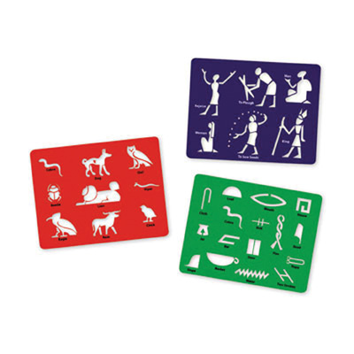 Hieroglyphic Stencils Set contains 3 durable, washable plastic stencils with a variety of people, animals and everyday shapes. Translation key included. Grade: All
