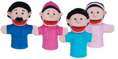Bring stories to life with these bigmouth family puppets. Great fun, plus they help develop language and communication skills. Embroidered eyes and features are soft and safe. Durable fabrics are surface-washable. 12" size comfortably fits little or big hands. Set of four ethnic family members and grandparents too.