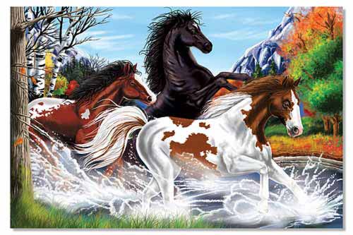 Lots of horses in your "neigh"borhood! A beautifully detailed herd of horses with manes flying are featured on this cardboard floor puzzle. 2' x 3' when assembled, the 48 extra-thick pieces. Its easy-clean surface keeps puzzle looking new.