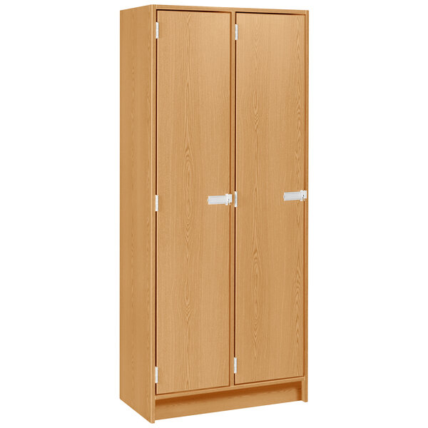 Provide a convenient and functional storage solution for employees or students with this I.D. Systems 30" x 18" x 72" maple double door storage locker with two shelves 79015 B30 This specific model features an attractive woodgrain finish, making it ideal for break rooms, schools, or employee centers. It is constructed of durable 3/4" thick components with thermofused laminated faces and impact-resistant edges to withstand frequent use. Plus, the laminate surfaces are scuff- and stain-resistant to maintain the lockers appearance.