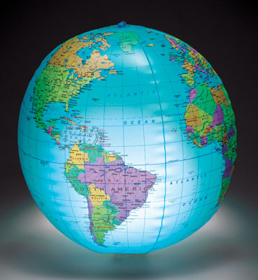 Spark curiosity about distant lands with this glowing view of the world.. Identifies continents, countries, cities, bodies of water, and lines of latitude and longitude with clear labels. Inflates and hangs as decorative night light. Includes 5000-hour LED bulb, hook, string, repair kit and Activity Guide. Measures 12" in diameter. Requires 3 alkaline (1.5 V) batteries, included