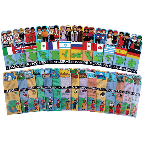 Kids Around The World Flashcards - 28 flashcards contain a country flag, country outline, famous landmark, capital, continent, animal life, plant life, currency, official language, exports, traditionally dressed children and fun facts.