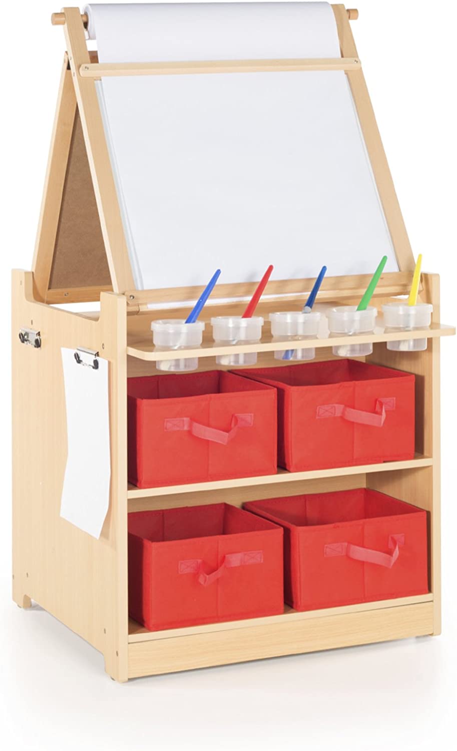 Give your budding artist the perfect space to explore their creativity with the Art Cart Desk to Easel Set by Guidecraft. This transformative set easily switches from a flat to angled drawing station with a durable hinge that locks into place. The easel can be set up as a chalkboard on one side and a write-on/wipe-off on the other for multiple drawers. The storage spaces on either side of the piece provide ample room for art supplies, including a spot for paint cups. Use the side display clips to show new creations or drawing inspirations. Features easy-to-clean laminate surfaces. Includes paper cubbies, a paint/glue bottle area, an 18″ x 100′ paper roll, five paint cups and side display clips. Replacement paper roll from Guidecraft – G98050. Easy to assemble. Four fabric bins measure 9″W x 9″D x 5″H each. Ages 3+. 22.5″W x 26″D x 42″H with easel fully assembled. 24″ flat desk height.