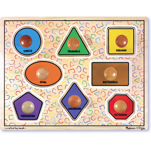 The Large Shapes Jumbo Knob Puzzle from Melissa and Doug makes a great introduction to shapes. Eight brightly coloured shapes with shape names printed on the each have an easy grasp, jumbo wooden knob. Each colourful piece has a matching picture underneath to assist kids in completing the puzzle. Puzzles are a great way to strengthen visual perception skills and build hand-eye coordination. This beginner puzzle is recommended for kids ages one and up.