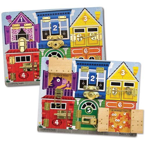 Work on manual dexterity with Locks & Latches from Melissa & Doug. Kids 3 and up can go on a hide and seek adventure filled with discovery as they undo Locks and Latches on the colourful puzzle board. Each door has a surprise image - a reward for successfully manoeuvring the Lock or Latch. The Locks & Latches Board Puzzle is a great exercise in hand-eye coordination! [