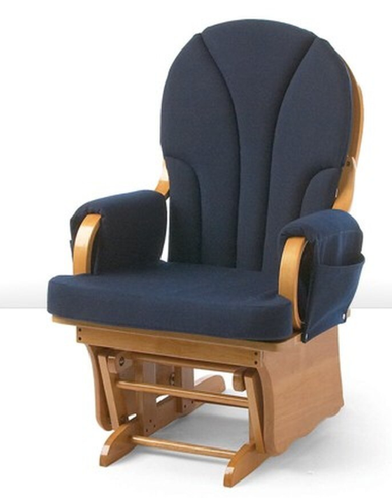 Lullaby™ is a great value for the cost conscious. The Glider is constructed of solid wood, has durable material that is easily removed for laundering (arm rests and seat cover only), and has storage pockets to help keep baby's necessities within reach. Comes in Natural color with blue padding. Assembles dimensions are 26"L x 25"W x 40"H. There is a limited one year warranty on wood base and a limited 3 year warranty on steel based glides. This glider is easy to assemble and includes all of the necessary tools.