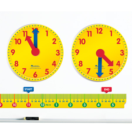 Includes 2 magnetic clocks with hands, 24-hour timeline (4 segments), start and end time arrows, and removable guide numbers
