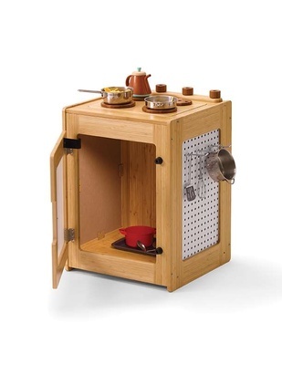 Stove: features features a clear door, rotating dials and burners, along with a magnetic whiteboard and a pegboard panel on the sides to add emergent literacy and imaginative play opportunities.