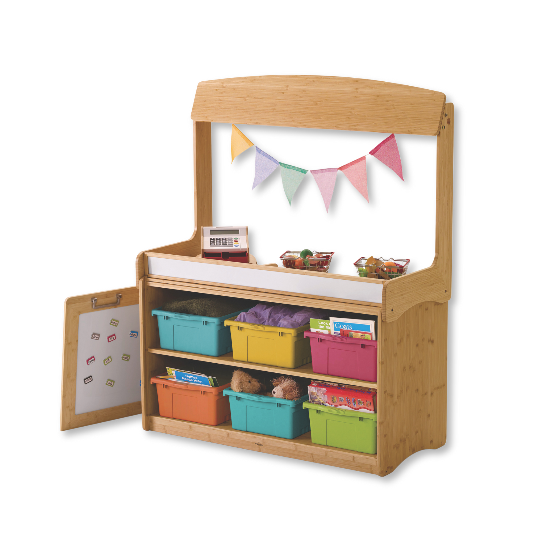 Includes a magnetic whiteboard, and holes at the top of the stand to add a DIY curtain rod or other hanging decor. Bamboo construction ideal for early childhood environments. Small magnetic whiteboard on the front (2.5” x 39.25”) to add emergent literacy and imaginative play opportunities. 1" Holes for DIY curtain rod. 2 shelves for storage. Measures: 51.5"H x 41.5"W x 18.5"D. Small magnetic whiteboard on the front measures: 2 .5”H x 39.25". Hideaway panel has a magnetic whiteboard (35”W x 15.75”H) on one side. The panel can be stored and used on the back of the shelf when not in use on the front. Tubs Measure 6"(15cm) H x 12 1/2" (32cm) W x 15 3/4"(40cm)