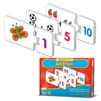 This colorful box of 30 sets of Match It! Addition puzzle cards provides children with an introduction to mathematics focusing on the development of addition skills. The cards are self-correcting as no two puzzle cuts are the same. Match It! Addition teaches the basic elements of mathematics in a fun and easy way. Recommended for ages four and up. Bilingual English and Spanish packaging.