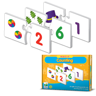 This colorful set of 30 counting puzzle cards provides children with an excellent introduction to mathematics and the concepts of number recognition and counting . Each card features the number of pictures that are associated with the matching answer. Simply match the number the correct number of objects to complete the puzzle. The puzzles are self correcting as no two puzzle cuts are the same. A fun way to learn the counting. Recommended for ages three and up.