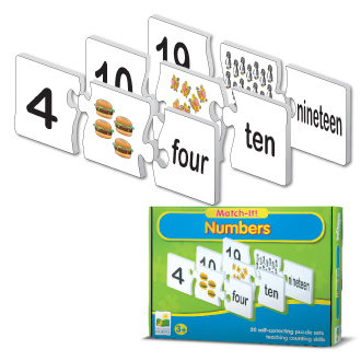 Each puzzle card has three pieces; the numeral, the same number of objects to count and the number in written form. By simply matching the pieces together, children will learn to recognize the numerals and spellings of the number. The puzzles are also self-correcting. Recommended for ages three and up.