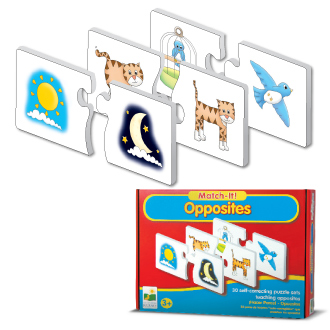 This colorful set of 30 puzzle cards challenge children to identify opposites. The puzzles are self correcting and will only fit their matching pair. Recommended for ages three and up.