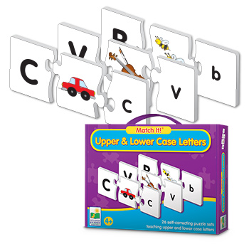 This colorful set of 26 letter puzzle cards provides children with an excellent way to learn their letters. Each card features the upper case letter, a picture of an object that starts with that letter and the lower case letter. Simply match the three pieces together to complete the puzzle. The puzzles are self-correcting as no two puzzle cuts are the same. A fun way to learn letters. Recommended for ages three and up.