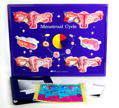 Model illustrates the menstrual cycle, depicting the four states of the average 28 day cycle. Two magnified ovaries show ovum development. Accompanying activity guide facilitates learning about this basic human body function with comprehensive information and discussion materials. Model measures 24" W X 18" H.