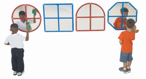 CF332-555. Mirror Windows to the World. Unique color windowpanes are silk screened on back surface so children's fingers never touch the paint. Smooth laser-cut edges highlight unique play possibilities. Mirror made of PET shatter-resistant material. Hardware not included. 22.5"l x 22.5"w