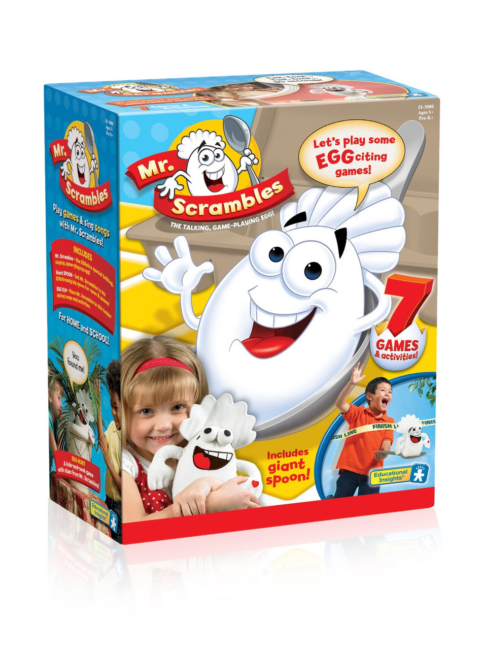 Seven "egg-citing" games and activities. Meet Mr. Scrambles, the talking, singing egg, that will have kids cracking up! An eggs-pert on having fun, Mr. Scrambles leads kids in seven egg-citing activities. There are energetic eggs-ercise games, a hilarious hide-and-seek egg hunt, and a spirited sing-along, featuring familiar favorites like "The Alphabet Song" even a cool rap! Plus, as kids are playing, they're staying active, developing important gross motor skills, and learning to follow directions. From his stylish bonnet to his goofy grin, Mr. Scrambles is the eggs-tra special new friend your kids have been waiting for! Requires 3 AAA batteries (not included).