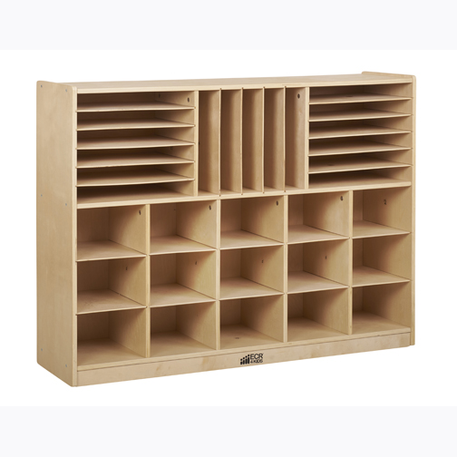 Unique, birch classroom storage unit designed for sorting and storing papers, homework and art supplies! Casters included for mobility.