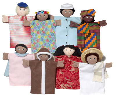 Multicultural Puppets, Set of 8 Set of 8 puppets. 9" tall. Includes White boy, Polynesian girl, Muslim boy, African girl, Indian girl, Eskimo boy, Chinese girl and Mexican boy. Machine washable, dryable. Grade: Toddler-2