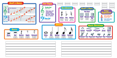 Music Symbols Bulletin Board Set Introduce children to the basic symbols of music. Large, clear, illustrations teach common symbols and terminology. Includes two Wipe-Off staffs for hands-on learning. 20 pieces. Largest piece is 8" x 25". Grade: K-6