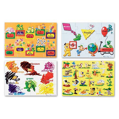 Four uniquely educational, colorfully creative floor puzzles for one low price! Each heavy-grade cardboard puzzle helps kids learn their ABCs, counting, colors and shapes with fun graphics and bright colors, and the easy-clean surface keeps the puzzles looking new for years to come. Each 12-piece puzzle is 12" x 18", 48 pieces total. Ages 3+.