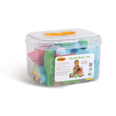 Includes Edu-Foam Wood-Like blocks and color blocks, plus Edu-Foam people, cars, trucks, trees and other city themed accessories. Packaged in a “tool box” style reusable container for easy clean up.