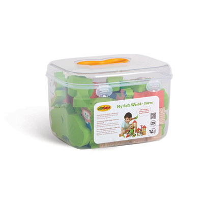ncludes Edu-Foam Wood-Like blocks and color blocks, plus Edu-Foam farmers, animals, trees and other farm themed accessories. Safe, Soft foam that looks like Real Wood! My Soft World Farm 29 pc set includes Wood-Like and Color blocks, People, Animals, Tractor, Trees & Bushes. 1¾" (3.5 cm) thick. Packaged in a “tool box” style reusable container for easy clean up.