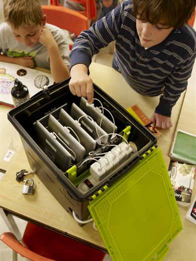 Description: EC600 Features: -Made from highly durable heat resistant ABS plastic. -Secure locking, storage and charging. -Vented to ensure airflow and prevent overheating. -6 Outlet powerbar and powerbar tray. -Locking block and pin to lock tub to counters and tables. -5 iPad/tablet device holder. Electric Outlets: -Yes. Commercial Use: -Yes. Primary Material: -Plastic. Shelves Included: -Yes. Finish: -Black, Green. Generic Specifications: -2 Padlocks with the same keys. Dimensions: Overall Width - Side to Side: -12.5". Overall Depth - Front to Back: -16". Overall Product Weight: -13 lbs. Overall Height - Top to Bottom: -14".