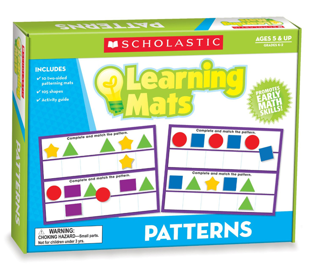 Teach visual discrimination and patterning skills with this engaging kit that includes 105 colorful shapes and 10 two-sided learning mats. Children use the shapes to extend a simple, repeating pattern on the mats. Each mat offers two levels of difficulty. These Patterning Mats help promote these important developmental skills in young learners - recognizing simple patterns, describing, extending, and explaining the next element in a simple, repeating pattern (problem solving and prediction), sort and organize shapes, identifying and describing 5 geometric shapes (square, circle, star, triangle and rectangle)