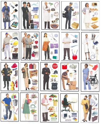 Set of 24 cards, highlighting community helpers that children commonly see working in their neighbourhoods, and a large variety of "Tools-of-the-Trade" photographs for each person. Includes word lists and activity ideas. Cards measure 8 1/2" x 5 1/2".