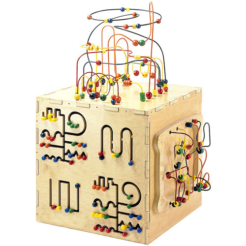 The Play Cube boasts: Rollercoaster Bead Maze, Pathfinder Panel, Magnet Express Panel, Ziggidy Zag Panel, and Sculpture Maze Panel.