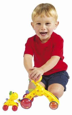 B37-2210 Press down on mama giraffe until she's flat and watch her and baby zoom across the floor. Mom and baby detachable and can be used separately. Ages 9 months +.
