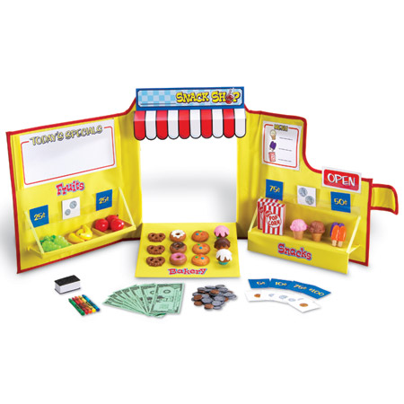 Talk about a convenience store—this shop is open and ready for business at a moment’s notice! It comes with more than 104 pieces including snacks, play money, write-and-wipe board for daily specials and many more shop items, all in a sturdy, tri-fold board carrying board that fastens shut when the Snack Shop closes. All components store in vinyl pockets when not in use.