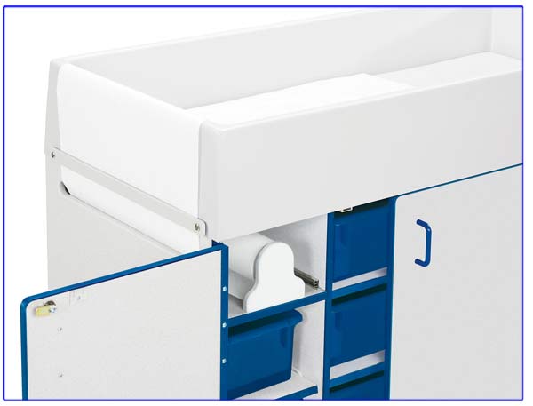 Molded 6½" deep plastic top and laminate surfaces stand up to rigorous cleaning. Safety treads on lockable, pull-out stairs. Glide-out paper dispenser (paper not included). Eleven colored cubbie-trays and changing pad included. Doors can be secured.