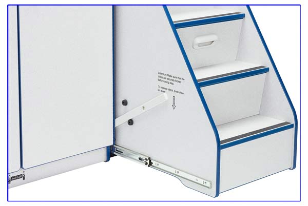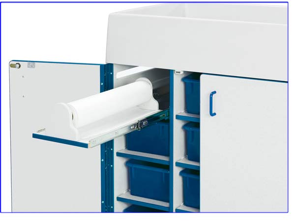 Molded 6½" deep plastic top and laminate surfaces stand up to rigorous cleaning. Safety treads on lockable, pull-out stairs. Glide-out paper dispenser (paper not included). Eleven colored cubbie-trays and changing pad included. Doors can be secured.