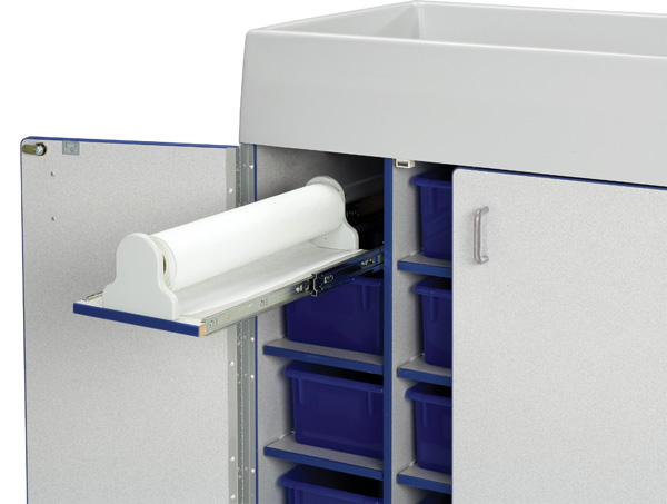 Stairs on Right Rainbow Accents Diaper Changer w/Stairs Molded 6.5' deep plastic top and laminate surfaces stand up to rigorous cleaning. Safety treads on lockable, pull-out stairs. Glide-out paper dispenser (paper not included). Eleven colored cubbie trays and changing pad included. Doors can be secured.