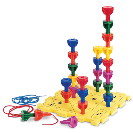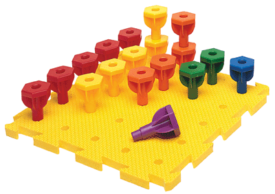 Rainbow Peg Play Activity Set Practice colours, numbers, shapes and hand-eye coordination with 30 Rainbow Stacking Pegs, double-sided tactile mat and two 36" laces. Oversized, hexagon-shaped pegs in six colours are easy to grasp. Reversible 8 3/4" x 8 3/4" mat is printed on one side for number and shape practice. Two or more mats can be interlocked. Suggested activities included. Grade: PreK-2