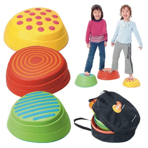 Rainbow River Stones The Rainbow River Stones from Weplay encourage creative play and interactions while also providing children with sensitivity, feeling and balance training. This set of six stones mimics the random flow of nature and can be used to create many free style routes for children to explore. Each stone features a texture on the top designed to stimulate the sole of the foot. Stones also have three directional points, this challenges children to pay attention to size and direction when piling stones on top of each other. Playing games with the Rainbow River Stones promotes coordination, encourages learning interest, improves balance and boosts self-confidence. Rainbow River Stones include a handy portable storage case. Recommended for children age three and up.