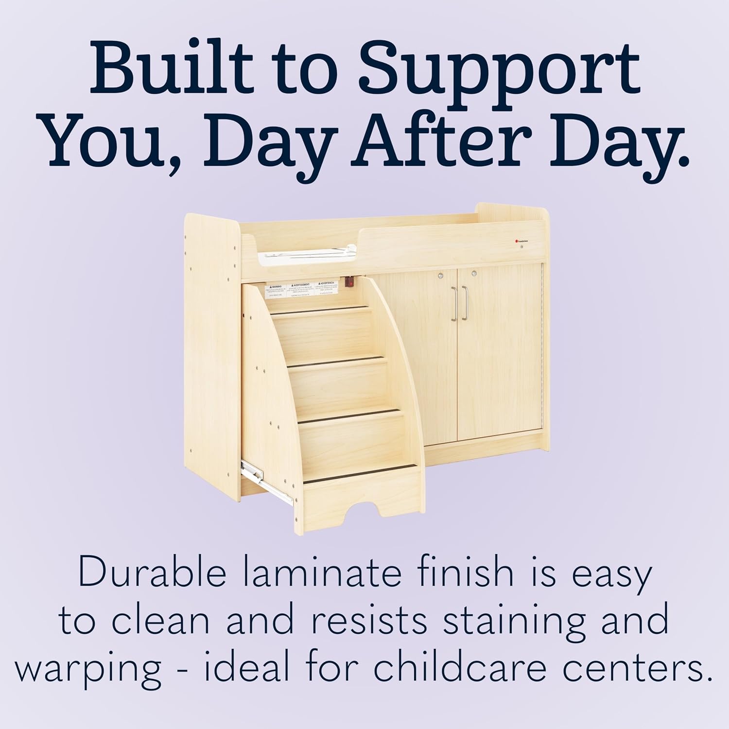 The SafeStep Commercial Staired Changing Table is built for the demands of childcare centers, preschools, and classrooms, providing a safe, durable, and functional solution for daily diapering needs. Designed with retractable wooden stairs, children can safely step up and down with the help of non-slip treads and a locking stair system. Made from sturdy engineered particle board with a laminate finish, this changing table resists stains and warping while remaining easy to clean. Double bend piano hinges reinforce the cabinet doors, while a fixed shelf and dual locking doors provide secure, organized storage for supplies. A built-in paper roll storage well adds convenience, and heavy-duty stair glides ensure lasting performance. Complete with a changing pad and safety strap, the SafeStep Changing Table offers a professional, space-efficient design available in both left- and right-stair configurations, making it an essential piece of daycare and classroom furniture.