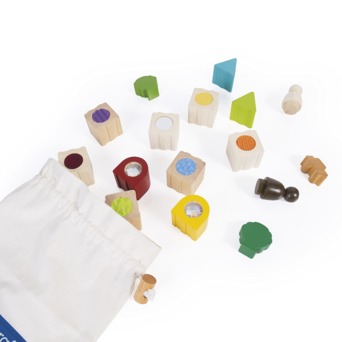 - Chunky rubberwood blocks use various inset textures, a mirror, and acrylic textures to enhance tactile exploration.