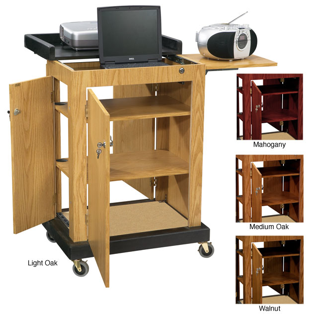 SCL multi-presentation mobile stand is perfect for presentations and seminars. This locking cart lectern is an affordable and computer friendly furniture. It has the provision for various equipments in one unit. Three locking doors provide secure storage on three inner shelves for equipment and A/V material. The stand has a 2” deep area where a laptop can fit, and a slide out locking shelf for projectors and multimedia equipment. It moves on industrial casters.