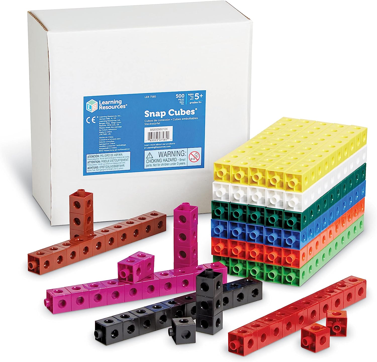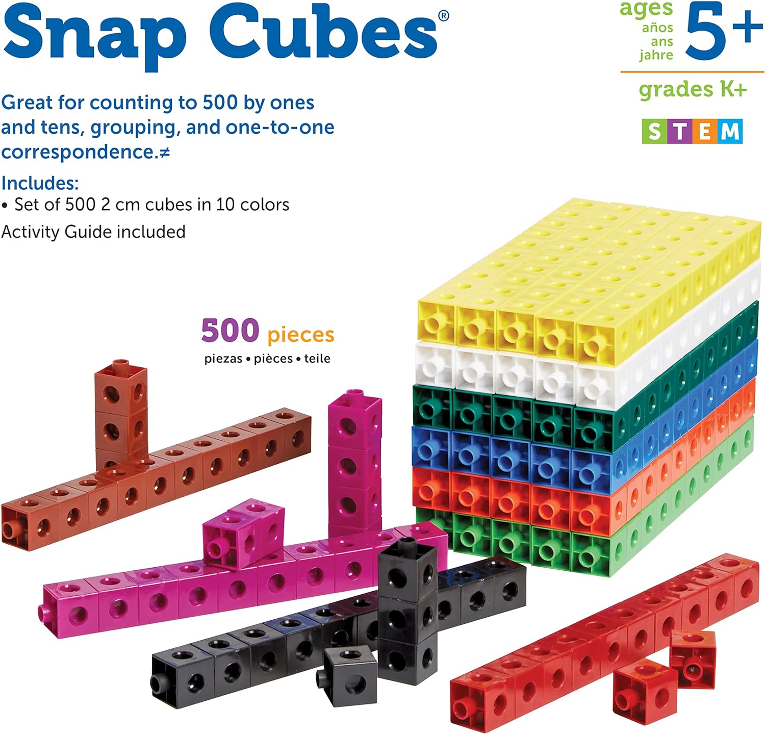 This set of 500 plastic cubes in 10 colors connect on all six sides. Easy for little hands to connect and twist apart. Can be used in place of any .75" cube, and fit in Unifix apparatus and materials.