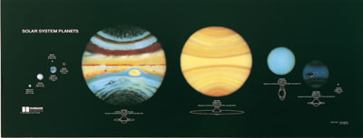 This dramatic representation of our solar system has been approved for accuracy and detail by the Adler Planetarium. The large 18" x 45" format depicts planet size differential, planet color, and information about rings and moons. Poster is printed on heavy paper stock to withstand classroom use.