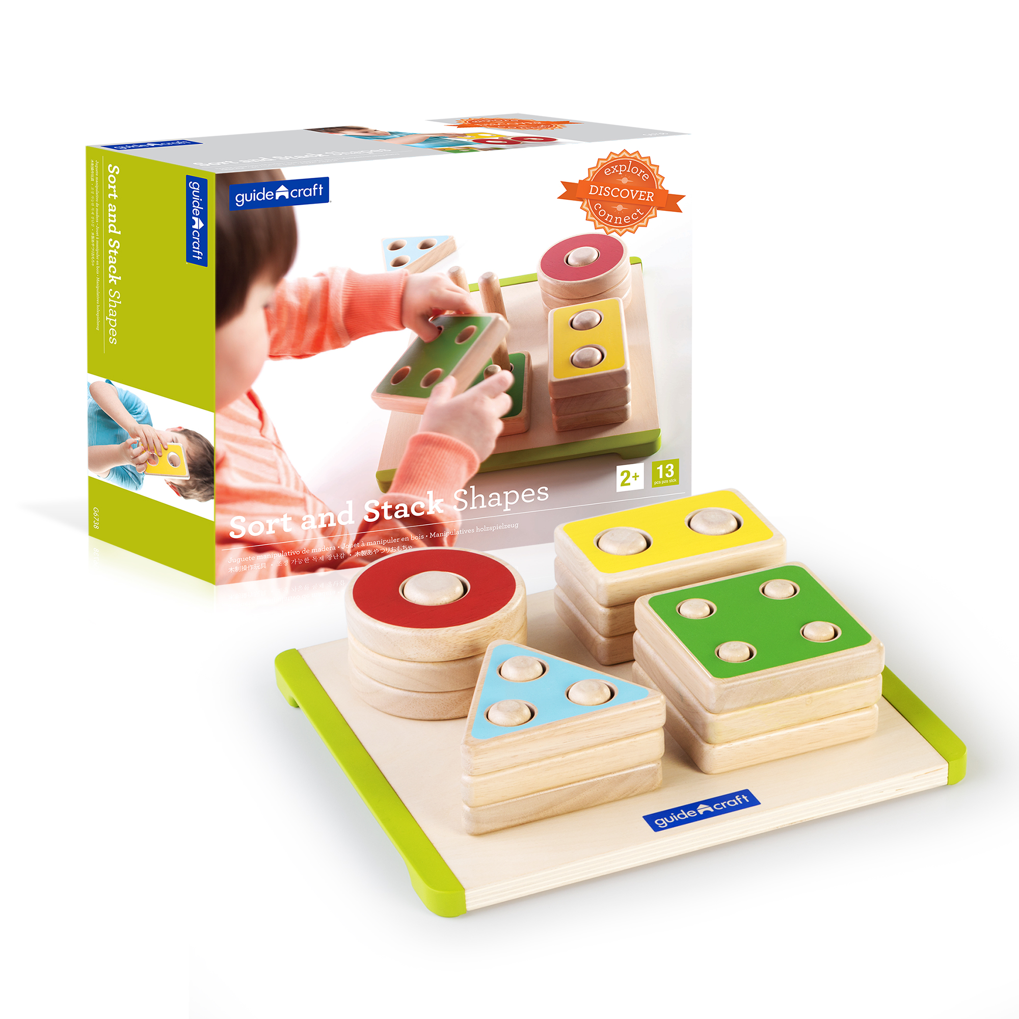 - Sort and Stack Shapes feature chunky wooden shapes with matching dowels