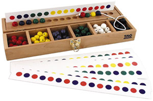 Complete learning center for developing skills from basic sorting to predicting logical patterns. After sorting by color, the child can independently close and latch the box, mix up the beads, and sort again and again. With the sorting tray in position, the child can match simple to complex patterns on the preprinted cards by placing the beads in order in the holes or by lacing the beads on a string. (Contains small beads)