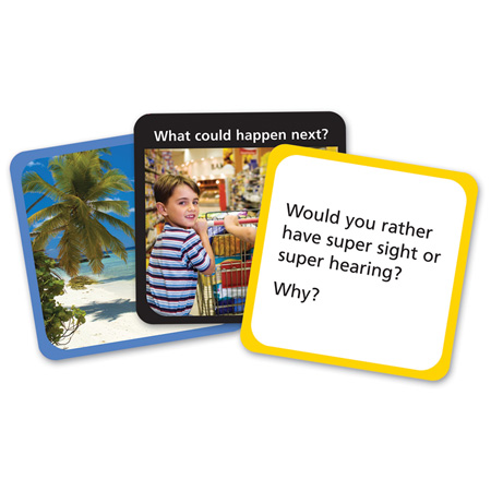 Build oral language, critical-thinking skills and confidence. Students reach into the box, pick a color coded prompt card, then get talking! Non-threating because there are no right or wrong answers. Topics include decisions, favorite things, steps in a simple process, descriptions of real life photos and more.