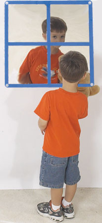 Square Windowpane Mirror. Unique color windowpanes are silk screened on back surface so children's fingers never touch the paint. Smooth laser-cut edges highlight unique play possibilities. Mirror made of PET shatter-resistant material.