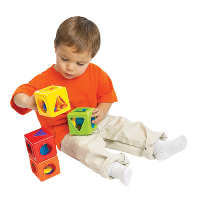 Set of 6 colourful, multi-sensory cubes contain visual, auditory and tactile features. Cubes can be stacked by matching interlocking shapes. Ages 6 months+.