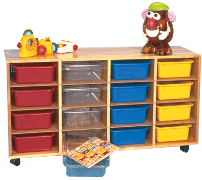 Storage Unit With 16 Trays Plywood Storage cabinet on castors. 16 - 10 1/2" x 13" x 4 1/2" tote trays for the ultimate storage of toys, clothes, or supplies. 12 coloured trays and 4 clear trays. 48"L x 26"H x 14"D. Grade: All