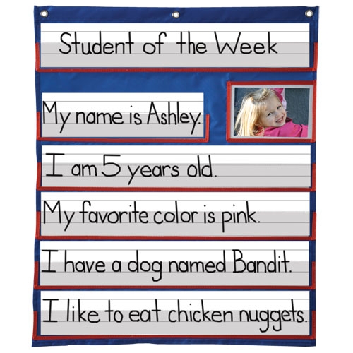 The Student of the Week Pocket Chart makes creating an "all about me" display easy. This durable pocket chart has seven clear pockets, one of which is a 4" x 6" photo pocket. Use sentence strips (not included) to write down facts about the Student of the Week. Chart measures 50cm x 61cm (19 3/4" x 24")